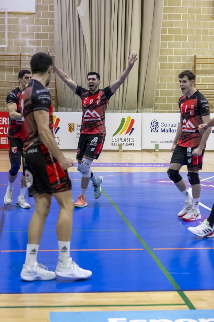 El tercer set arrancó muy parejo, con errores en el saque y puntos repartidos. El Manacor destacaba en ataque y bloqueo, mientras que los visitantes sostenían la ventaja con varias acciones defensivas. Un parcial de 5 puntos capitaneado por el servicio de Romaní rompió con el tanteo de puntos presenciado hasta el momento y les dio el empuje para cerrar el set 25-18.