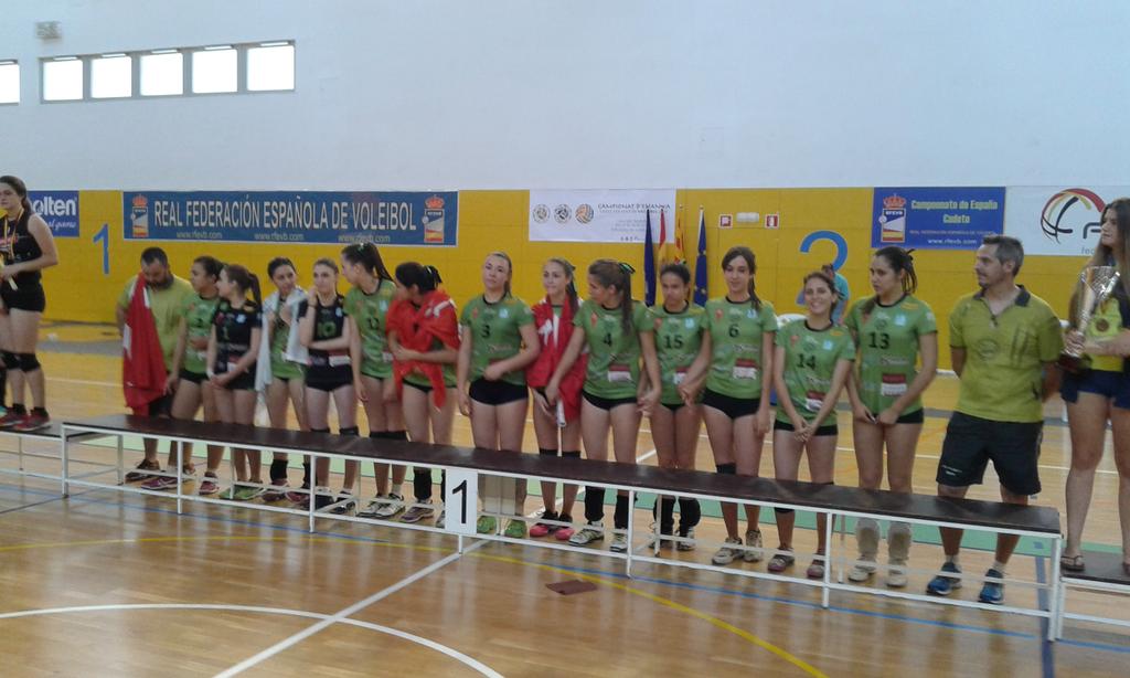 ADV Rivas se convirtió esta mañana en el nuevo campeón de España cadete femenino al superar a CV Sant Cugat en una vibrante final disputada en Esplugues de Llobregat, Barcelona. Las madrileñas vencieron en el desempate mostrando su control y dominio del juego para tomar ventaja en dos ocasiones. Las barcelonesas igualaron en las mismas ocasiones para llevar el choque por el cetro nacional hacia el desempate. Un ajustado y agónico tiebreak fue poco a poco acercándose a su desenlace con continuas igualadas. Las ripenses aumentaron la intensidad de su juego para obtener la mínima renta y hacerse con el triunfo y el título español con 3-2 (15-25, 25-21, 15-25, 25-20 y 13-15), El tercer lugar del Campeonato de España Cadete femenino fue para el conjunto anfitrión, CV Esplugues que vencieron en la final de consolación a IBSA CCO 7 Palmas. Las canarias forzaron el desempate tras los dos primeros triunfos locales, pero las catalanas mostraron en el tiebreak de nuevo su mejor juego para conquistar el tercer lugar del torneo por 3-2 (25-21, 26-24, 18-25, 27-29, 15-12).