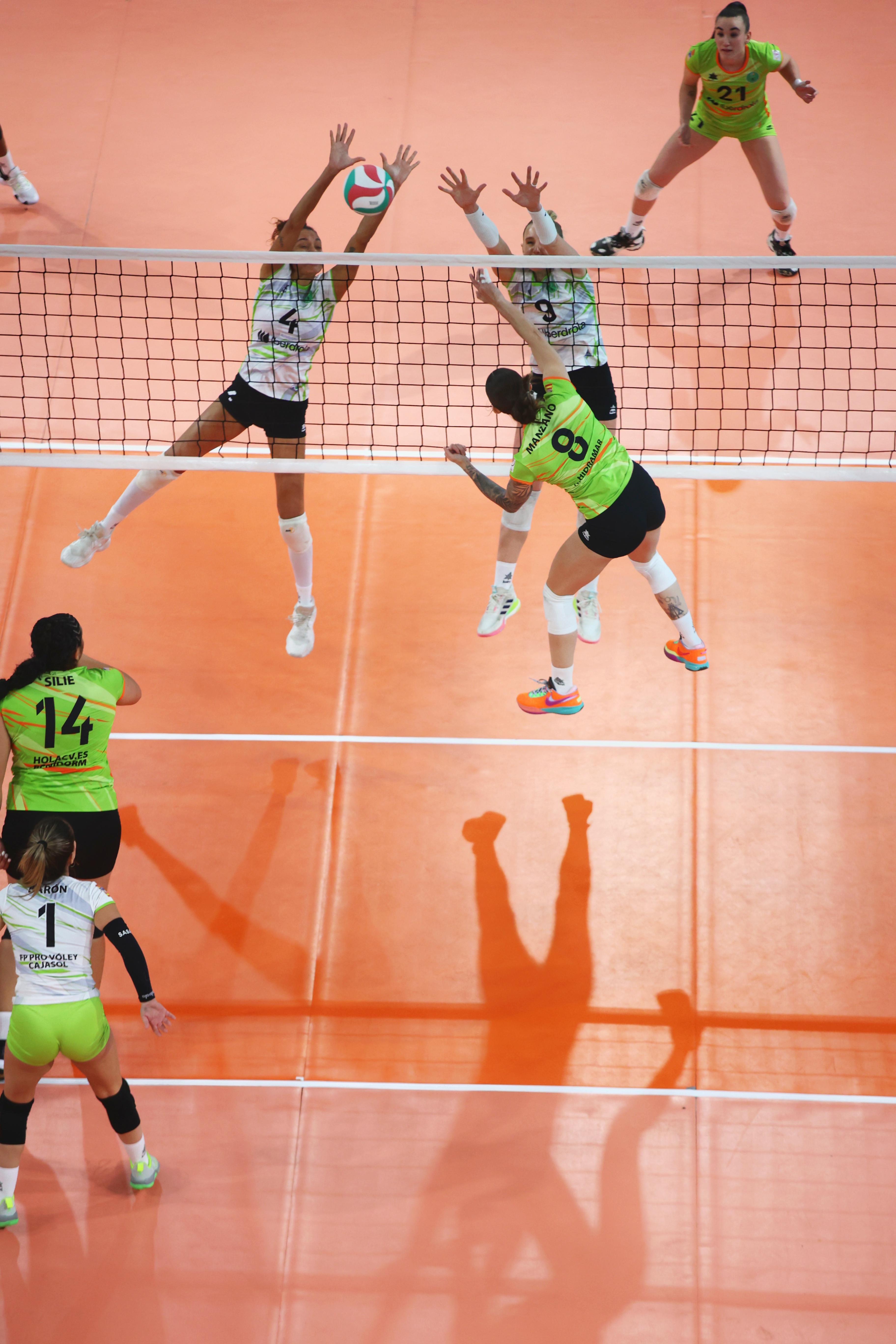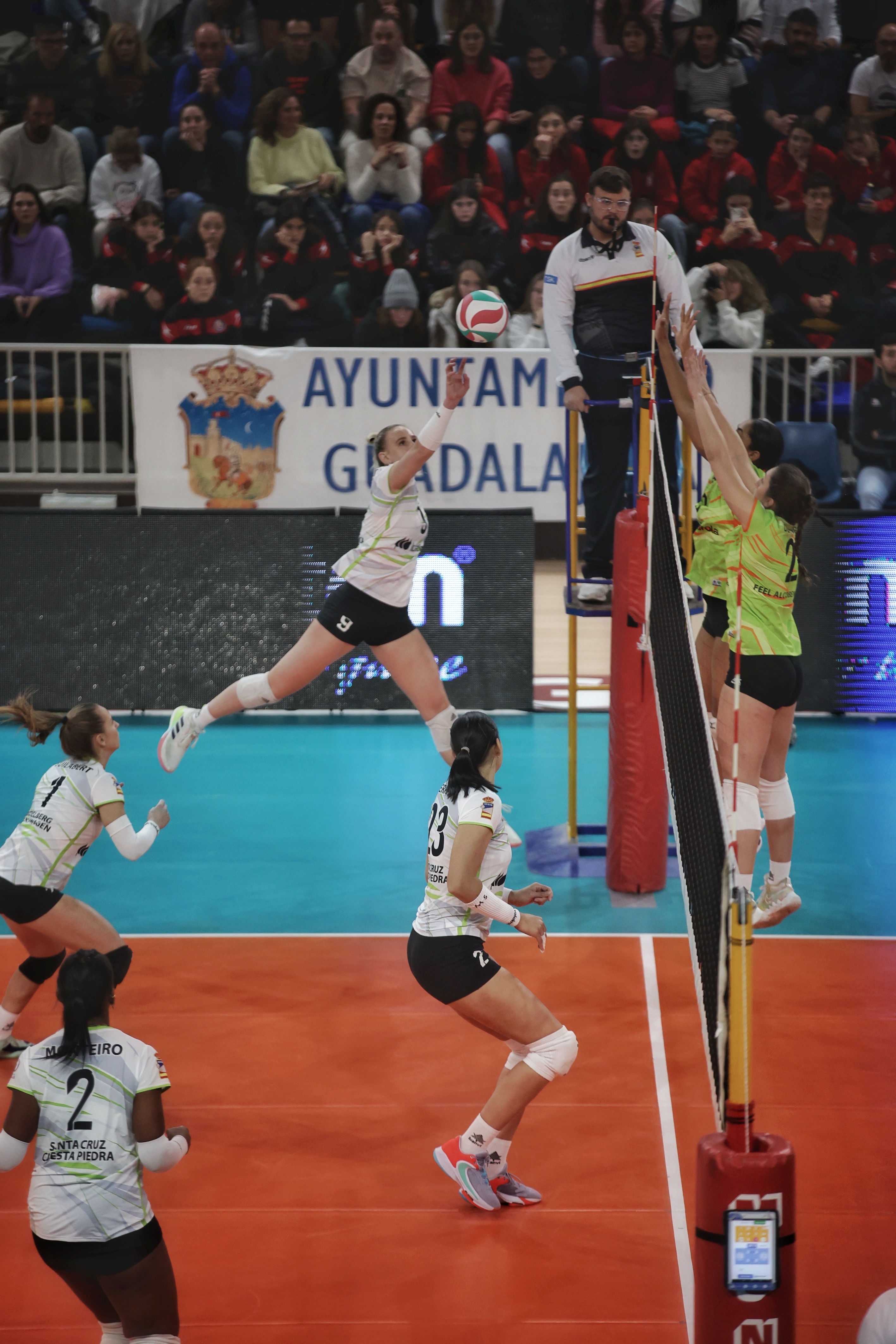 El equipo verde arrancó el enfrentamiento abajo en el marcador, pero pronto sería capaz de darle la vuelta al guion de la batalla para dominar el electrónico con firmeza una vez superado el ecuador de la manga. Linda Costa inspirada en el centro de la red, Isabel Barón intratable en la retaguardia y Saray Manzano infalible desde cualquier ángulo del campo, complicaron el juego del equipo blanco, para, tras un final muy ajustado, cerrar el set a su favor por 27-25.