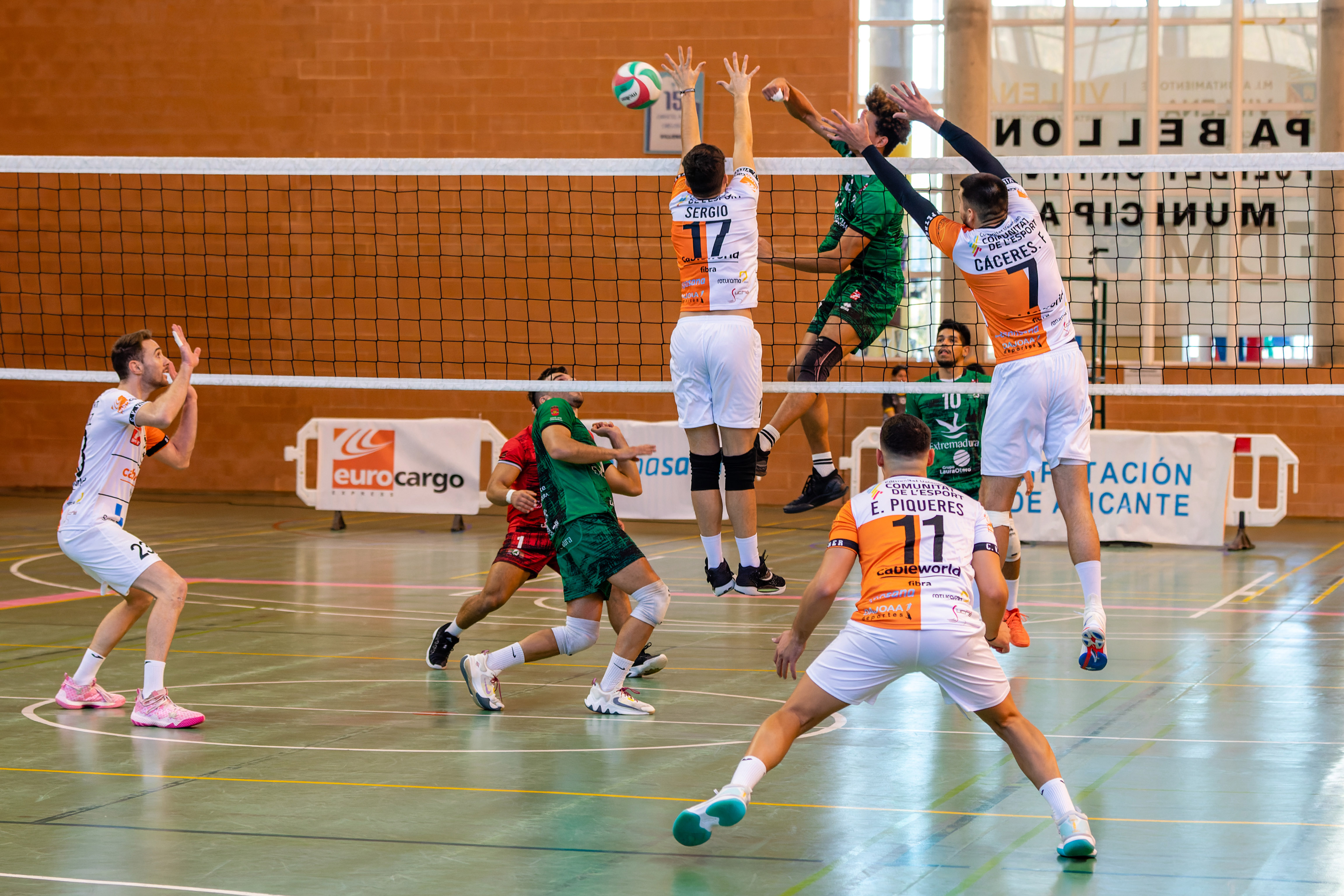 En el primer set la igualdad ha sido la tónica, pero en los últimos puntos el ataque contundente de Tomas Hernández hace llegar con ventaja a Villena-Petrer para cerrar el set por 25-18.