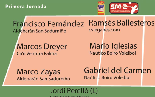 El siete ideal de la jornada se compone por el colocador de Aldebarán San Sadurniño, Marco Zayas; el opuesto de cvleganés.com Ramsés Ballesteros; los receptores Francisco Fernández, de Aldebarán San Sadurniño y Gabriel del Carmen, de Náutico Boiro Voleibol; los centrales Marcos Dreyer, de Ca’n Ventura Palma y Mario Iglesias, de Náutico Boiro Voleibol y el líbero de Ca’n Ventura Palma, Jordi Perelló.