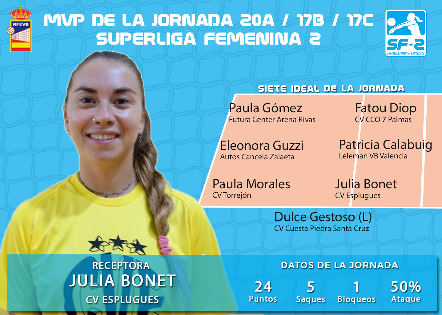 Acompañando a Julia Bonet en el siete ideal se encuentra la receptora de Futura Center Arena Rivas Paula Gómez, las centrales Patricia Calabuig de Léleman VB Valencia y Eleonora Guzzi de Autos Cancela Zalaeta, la opuesta de CV CCO 7 Palmas Fatou Diop, la colocadora de CV Torrejón Paula Morales y la líbero de CV Cuesta Piedra Santa Cruz Dulce Gestoso