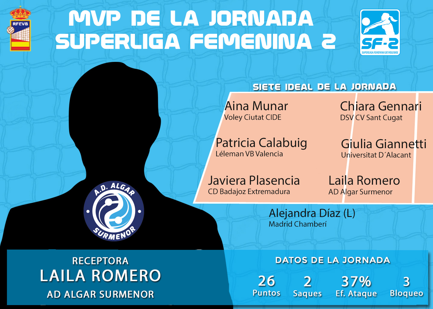 La receptora de AD Algar Surmenor Laila Romero es la MVP de la primera jornada de Superliga Femenina 2. La cartagenera alcanzó la cifra de 26 puntos con 1 saque directo y tres bloqueos para contribuir a la victoria de su equipo en el desempate ante Mairena Vóley Club.