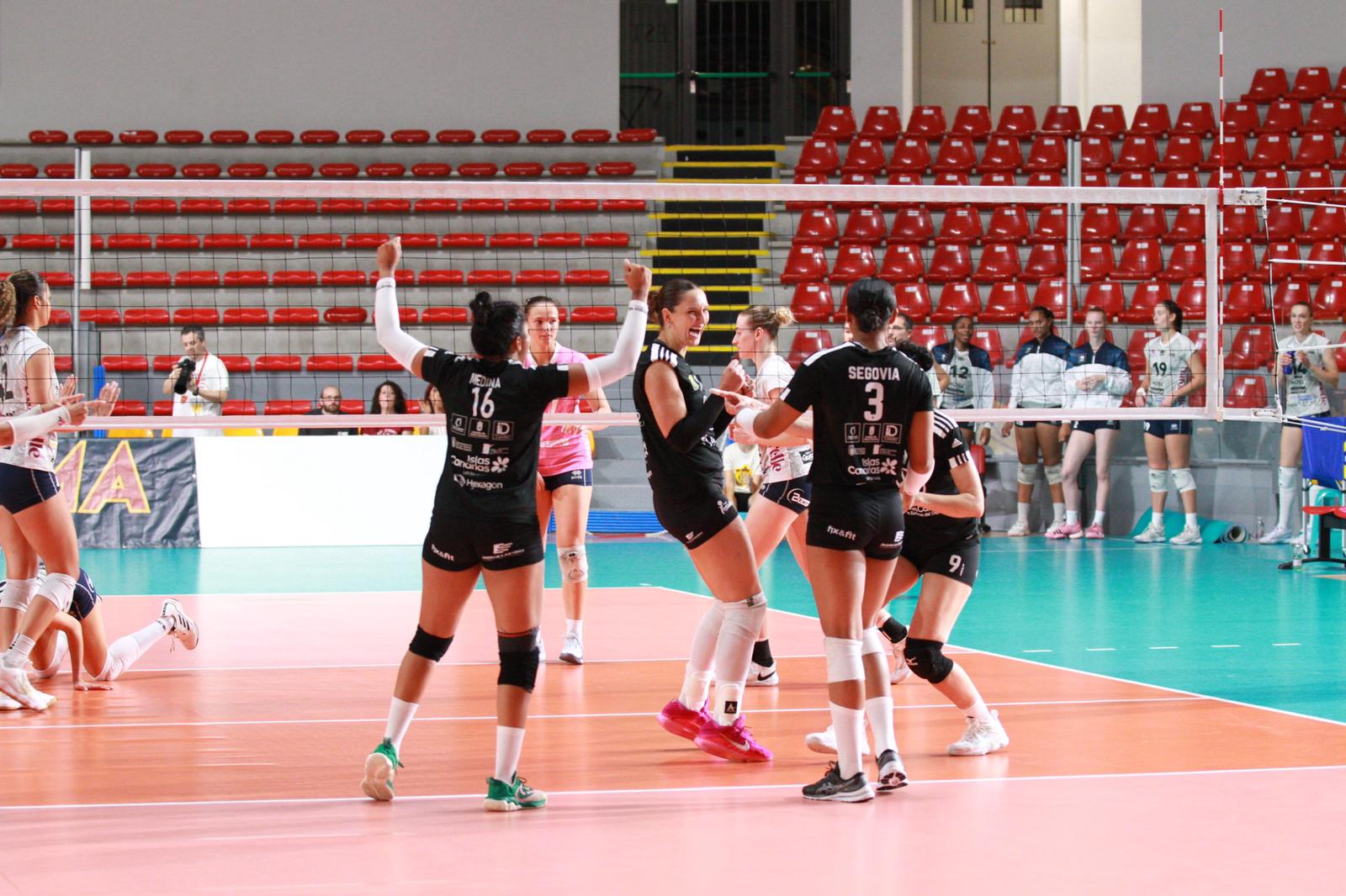 Las grancanarias volvieron a remontar un 0 a 2 para terminar imponiéndose en la muerte súbita con parciales de 22/25, 26/28, 25/22, 25/22 y 16/14. Mañana la final ante el conjunto local del Roma Volley a partir de las 18:00 (hora local).